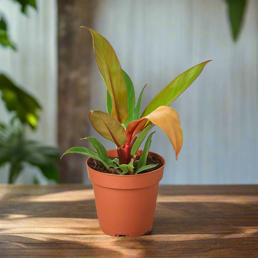 - Description: The Philodendron Prince of Orange gets its name from its uniquely hued leaves, which change color over time. New growth starts a starburst yellow when it first emerges, transitioning first to copper tones, and ultimately settling into darker shades of green. This plant is a self-heading Philodendron hybrid.